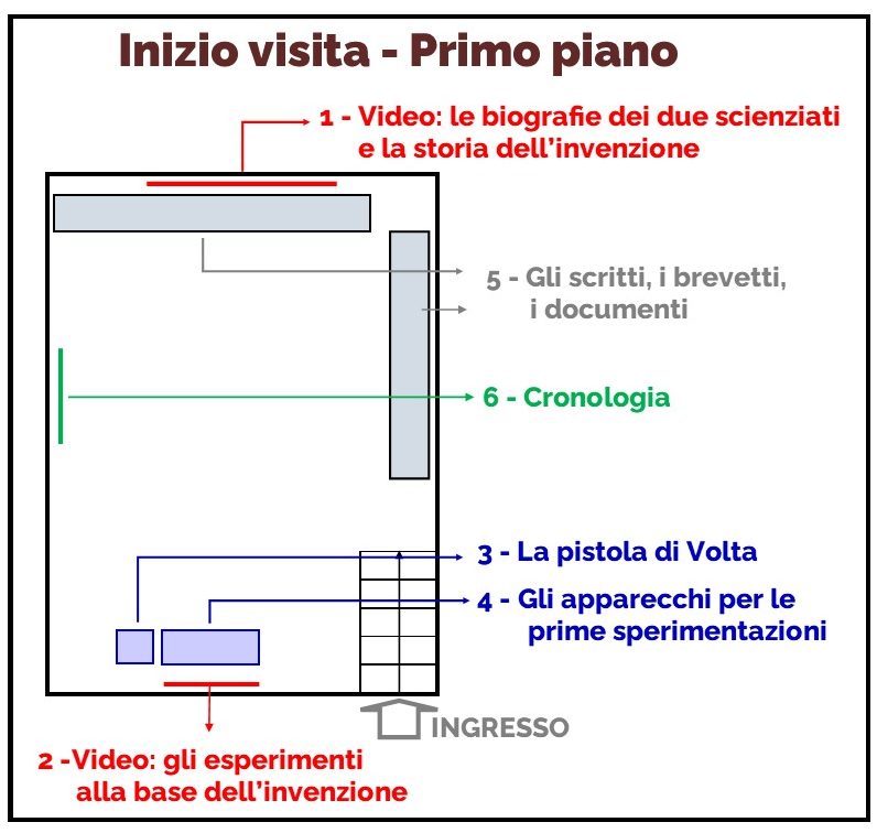 Nella sala al primo piano, si può assistere alla proiezione di videoclip che illustrano la vita e le opere dei due scienziati; vi sono esposti i modelli degli apparecchi utilizzati per i primi esperimenti: un videoclip, per mezzo di disegni animati e grafici, illustra tali esperimenti ed i risultati ottenuti, da cui i due scienziati ricavarono l’intuizione alla base del funzionamento dei loro motori.