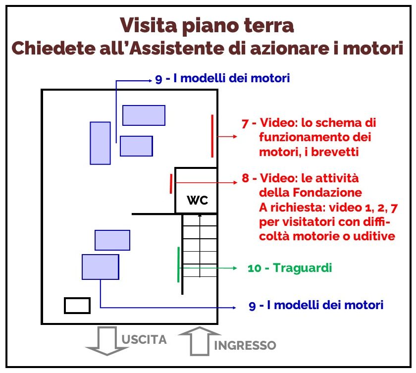 Nelle sale al piano terra, sono esposti modelli in grande scala che riproducono in movimento i motori progettati dai due inventori; un video ne illustra, attraverso disegni animati, le principali caratteristiche di funzionamento.