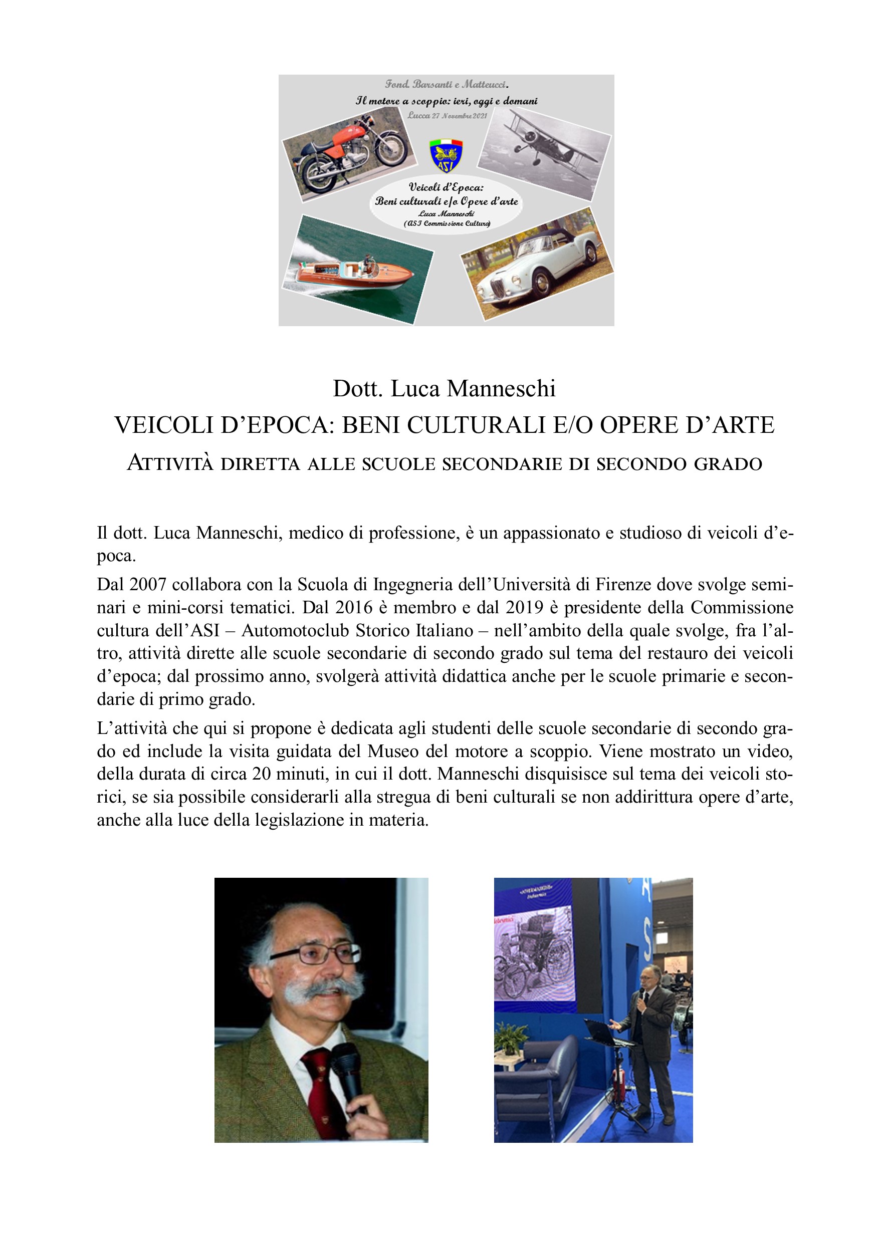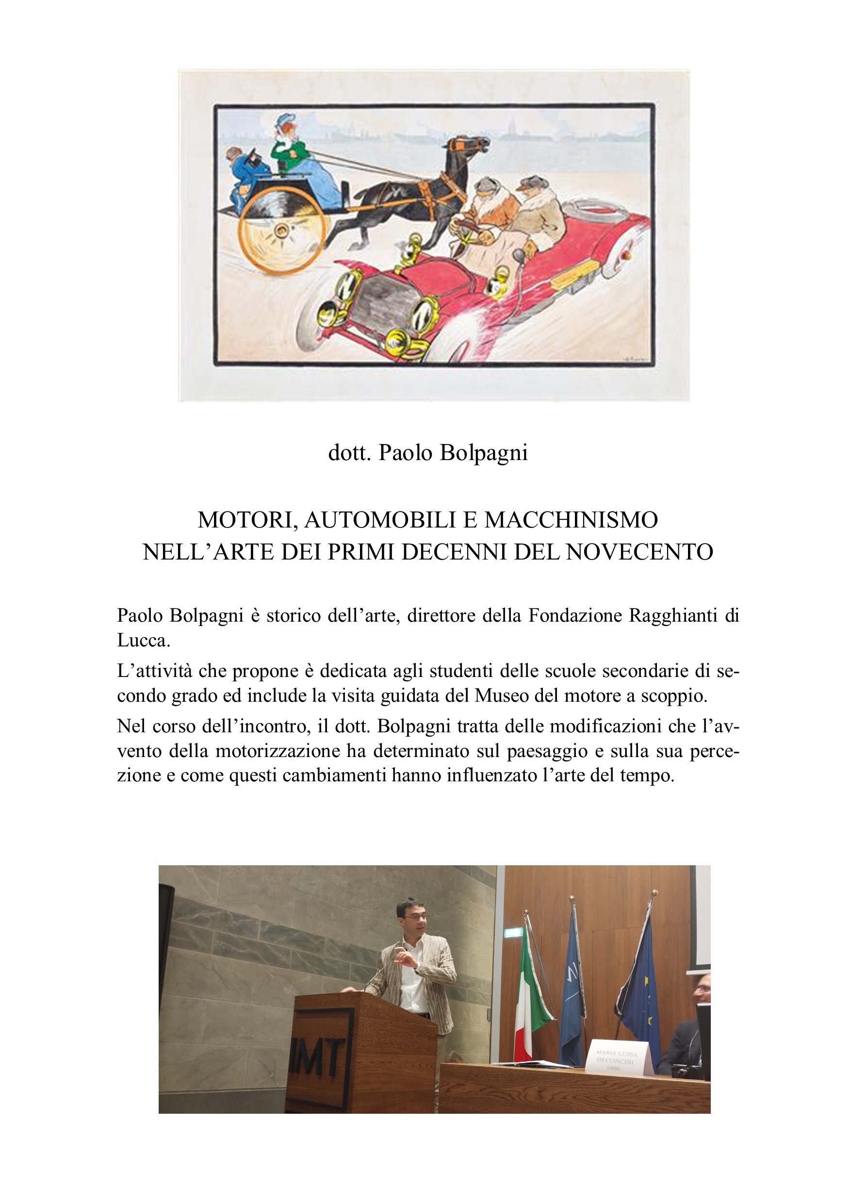 Una delle attività di maggior rilievo è stata dedicata agli allievi del Liceo scientifico Vallisneri di Lucca, per i quali sono state organizzate visite guidate al Museo per gruppi di una o due classi, ed una attività plenaria incentrata sul Futurismo quale espressione della trasformazione culturale prodotta dall’avvento dei veicoli a motore.