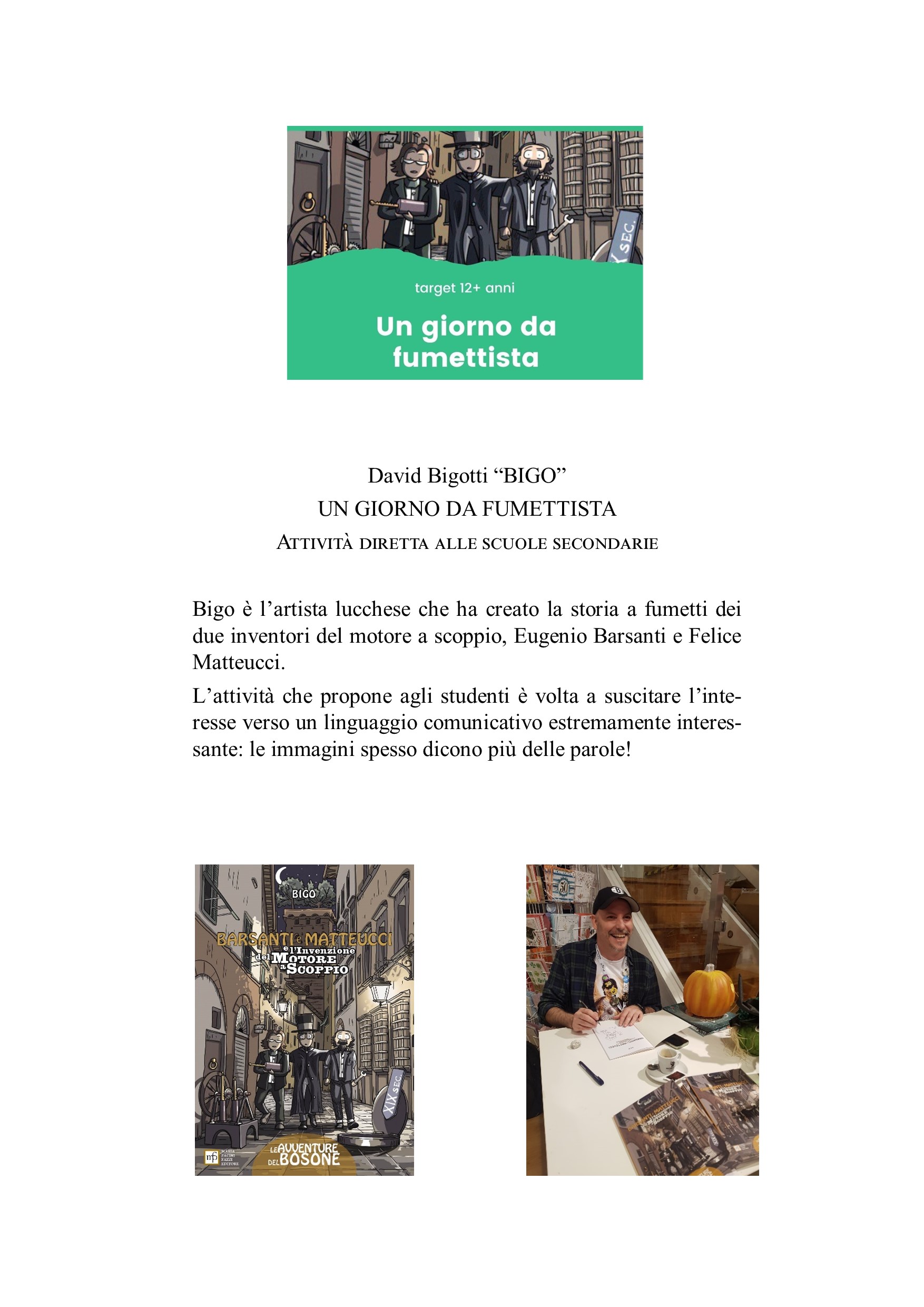 A partire dall’anno scolastico 2022-23, la Fondazione, con il patrocinio dell’Ufficio Scolastico di Lucca-Massa Carrara, ha allestito il progetto “BRUM BRUM! Accendiamo i motori” destinato alle scuole di ogni ordine e grado, che prevede attività guidate da docenti esperti e finalizzate a far conoscere la storia dei due inventori lucchesi e della loro invenzione, nonché a suscitare la curiosità e l’interesse dei giovani su argomenti tecnici legati alla motoristica. Le modalità di svolgimento ed il linguaggio sono appropriati alle diverse fasce di età.