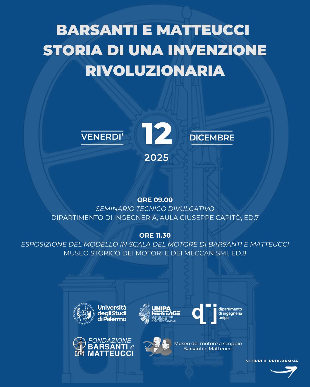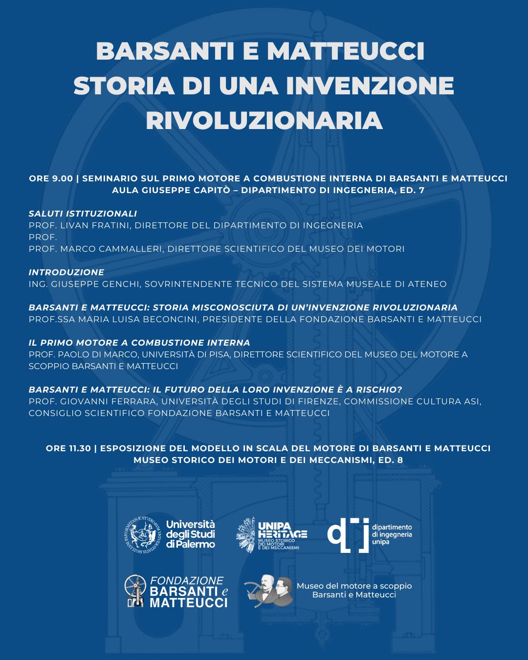 Nell’ambito dell’accordo stipulato fra Fondazione B&M e Università di Palermo, venerdì 12 dicembre, presso la Scuola di ingegneria di Palermo, si è svolta la cerimonia di presentazione del motore di Barsanti e Matteucci, offerto in comodato dalla Fondazione, che resterà esposto nel Museo dei motori e dei meccanismi dell’Università.